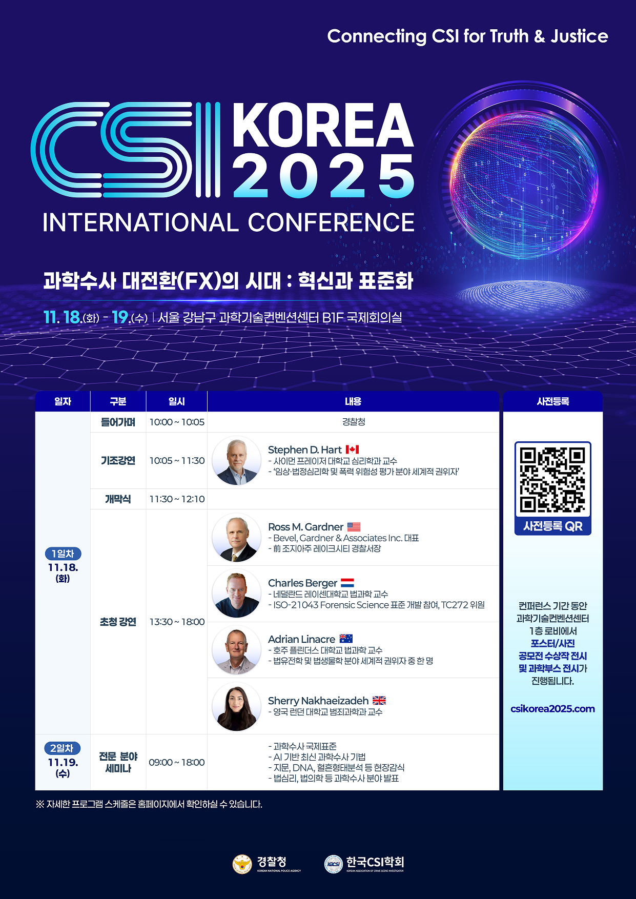 3. 위와 관련,「2025 제11회 국제 CSI 컨퍼런스」의 성공적인 행사 개최를 위해 과학수사에 관심 있는 분들에게 홍보 및 단체 참가 등록 관련 협조 바랍니다.