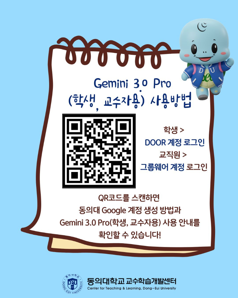아래 링크에서 동의대 Google 계정 생성 방법과 Gemini 3.0 Pro(학생, 교수자용)버전 사용 안내를 확인할 수 있습니다.