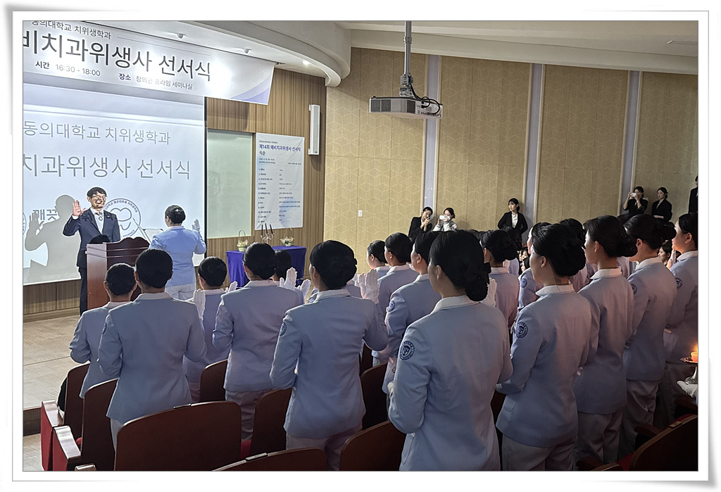 예비치과위생사 선서식은 치과위생사로서 국민의 구강건강 증진을 위해 사랑과 봉사정신으로 실천할 수 있는 마음가짐을 다짐하는 자리로 이날 윤성영 학생 외 47명이 선서식에 참여했다.